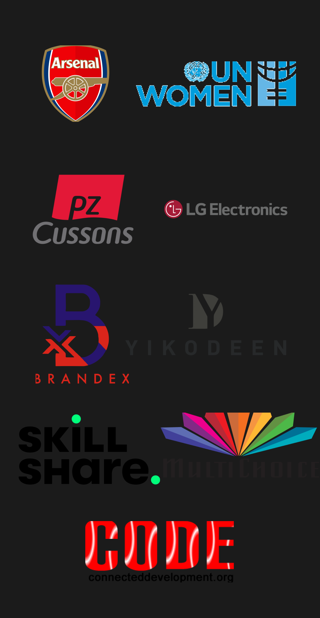 He has worked for brands like LG Electronics West Africa, Arsenal FC, Remy Martin, Yikodeen, PZ Cussons, Skillshare USA and UN Women. Currently working with Budweiser and NIVEA MEN.